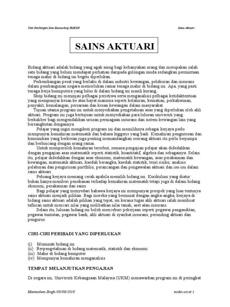 Jadual kemortalan paling lama digunakan dalam sejarah sains aktuari iaitu . Bergantung kepada kolej atau universiti mana korang pergi, sains aktuari boleh berada di fakulti bisnes ataupun fakulti matematik. Ramai bercakap mengenai usaha melahirkan profesional bumiputera dalam bidang kewangan, terutama aktuari, namun sejauh mana usaha kita ke arah . Dalam perancangan ekonomi dan pelan pembangunan negara seperti mana pentingnya. Sebab nya job opportunity sangat luas ! Uitm, ue4462002, diploma sains aktuari, 05 semester.